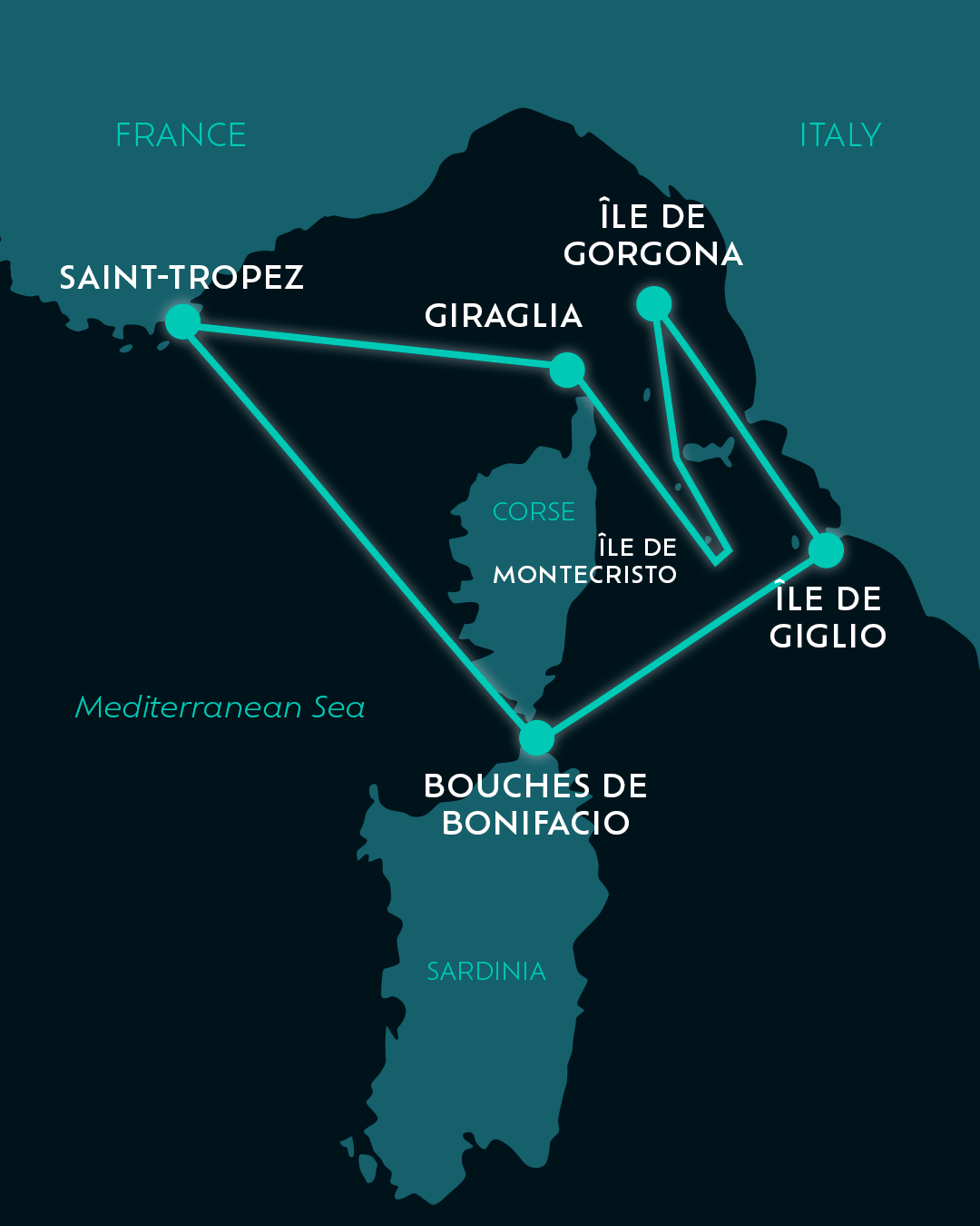 A 600-mile route starting in Saint-Tropez and passing through the Strait of Bonifacio, the islands of Giannutri, Gorgona, Pianosa, the Giraglia rock, and Vaquette Island, finishing back in Saint-Tropez.